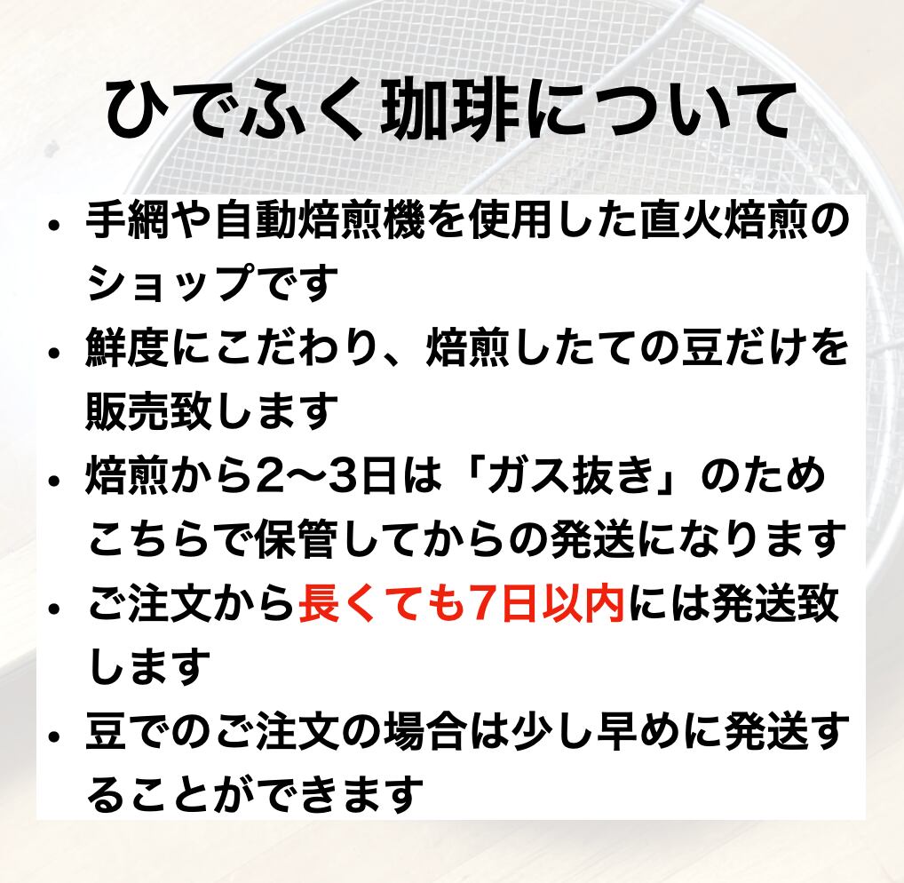 密閉瓶で保存し、焙煎日より2週間以上置いておく場合は冷凍保存をおすすめします。