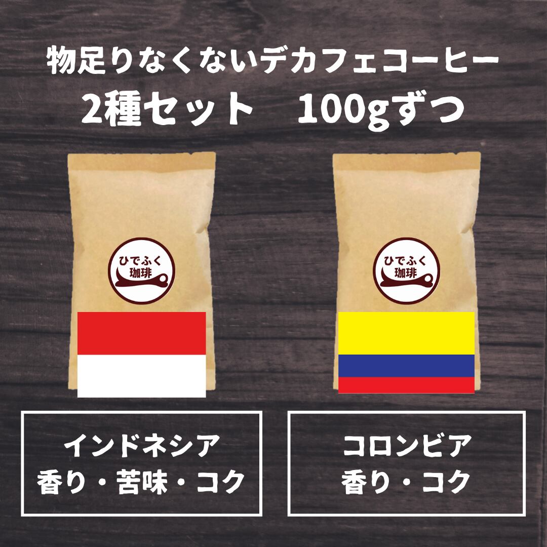 本商品はインドネシアとコロンビアのデカフェコーヒーが100gずつ入ったセットです。それぞれ違った香りをお楽しみください!